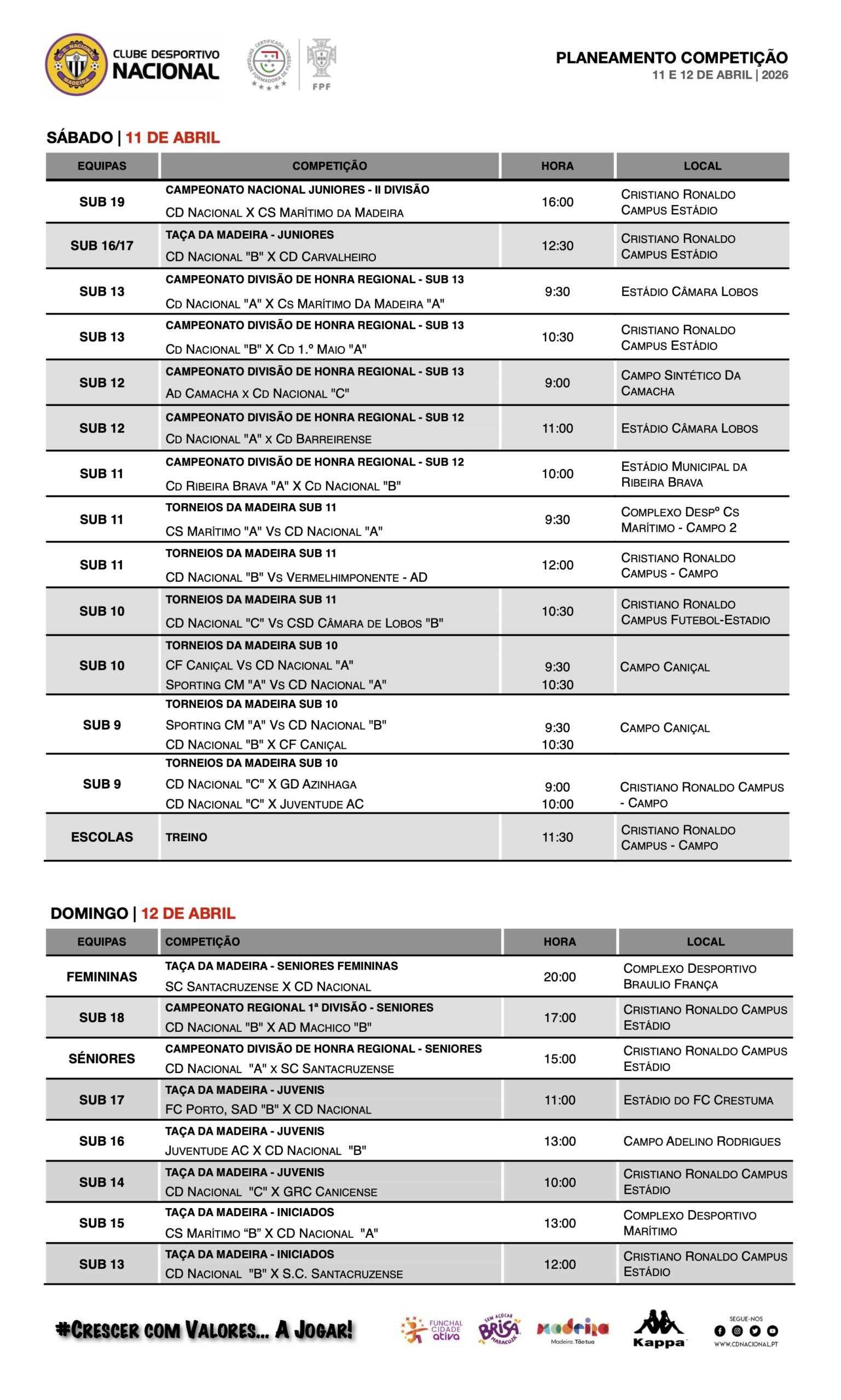 Os Benjamins entram em campo para mais uma jornada dos Torneios da Madeira, em Sub-10 e Sub-11. Os Sub-12 e Sub-13 disputam mais uma ronda dos Campeonatos Divisão de Honra Regionais, nos referidos escalões.