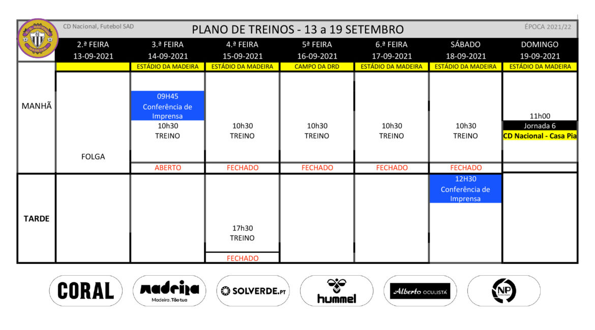 Plano de treinos da equipa de futebol profissional para a semana de 13 a 19 de Setembro.