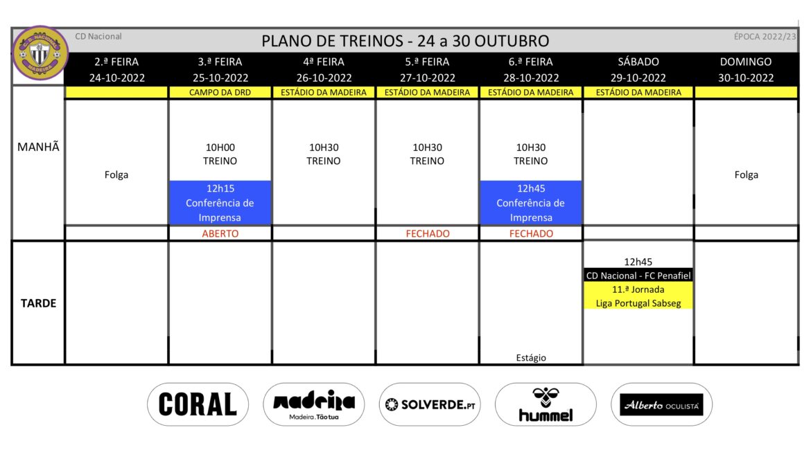 Plano de treinos da equipa de futebol profissional para a semana de 24 a 30 de Outubro.